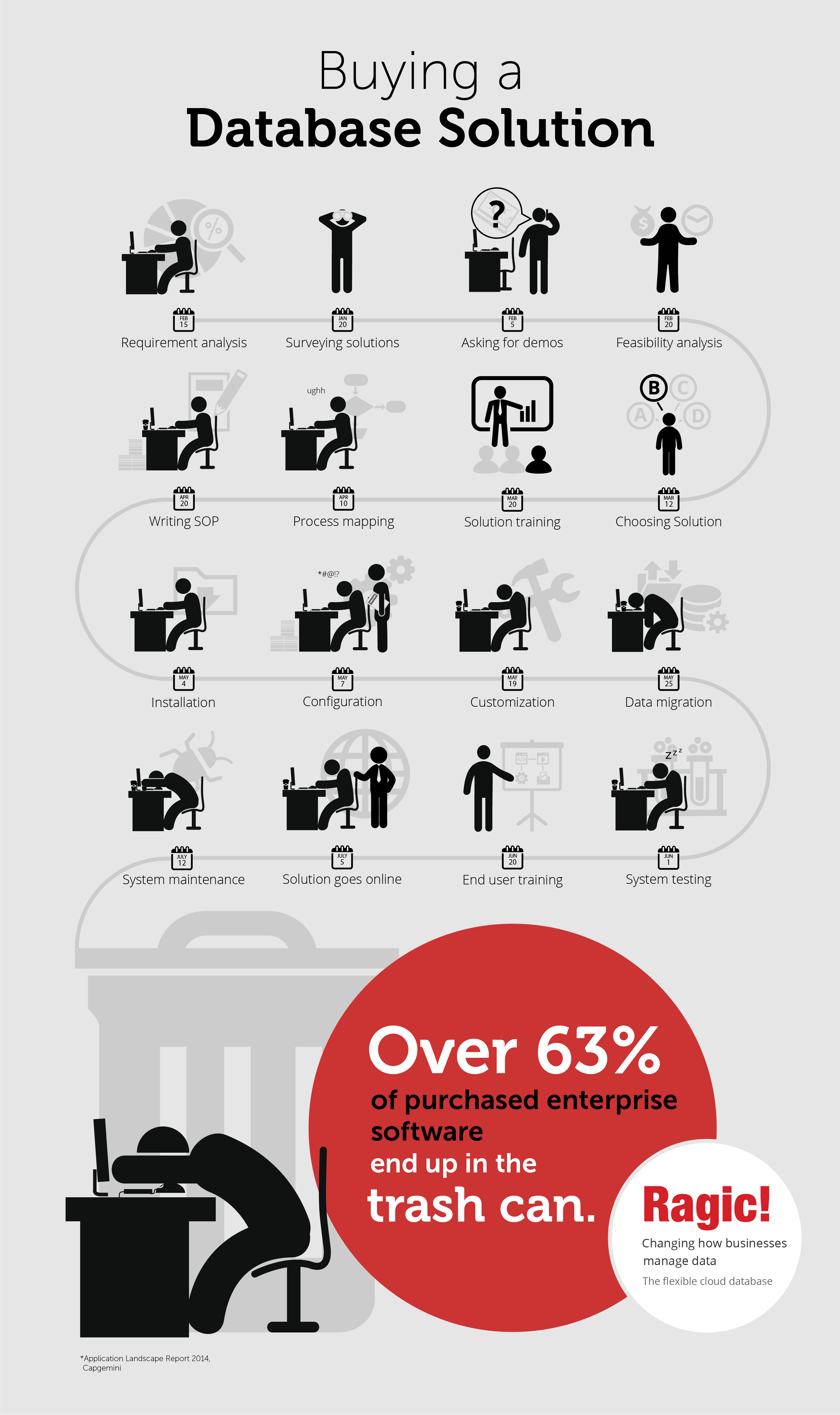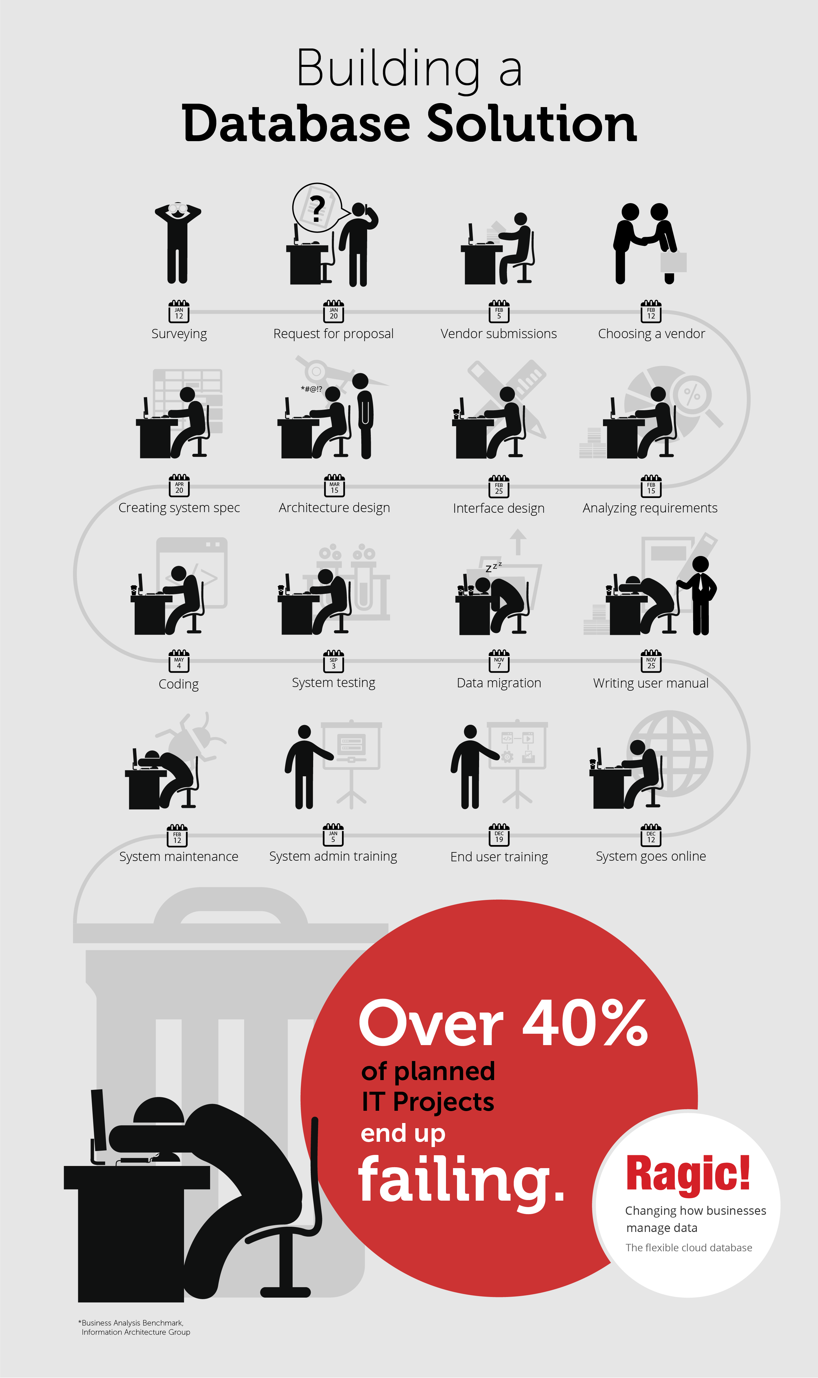 B) Build your own system. On the other side of the road is to build it yourself. Whether it's developed in-house or outsourced, you build a fully customized database application to fit your business perfectly. But good software takes years to develop, and custom projects rarely enjoy the luxuries of ample time and money. Custom projects are usually built by the clueless (typically the lowest bidder), and everything is done to minimize costs. It's no secret that IT projects are incredibly costly and fail often.